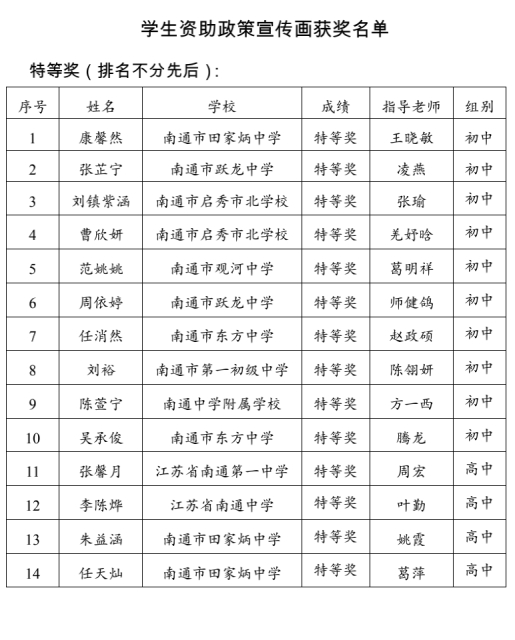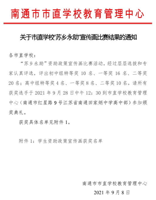 在刚刚结束的南通市直学校“苏乡永助”宣传画比赛中,我校任消然同学获特等奖,沈佳璐同学获一等奖,黄紫怡、李雨婷、程思彤、袁欣妍四位同学获二等奖。特此祝贺!
