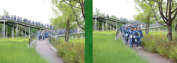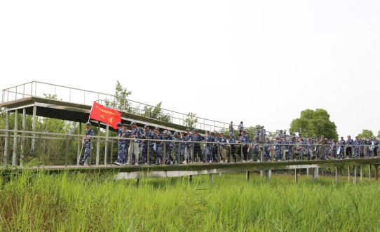 绵延数百米的拉练队伍形成一道靓丽的风景线。各班之间紧密衔接,队伍井然有序。同学们穿着迷彩服,身影与一草一木相融,与潋滟湖光辉映。同学们意气风发,精神昂扬;每踏一步,铿锵有力。每一个训练项目,同学们全力以赴,认真完成。