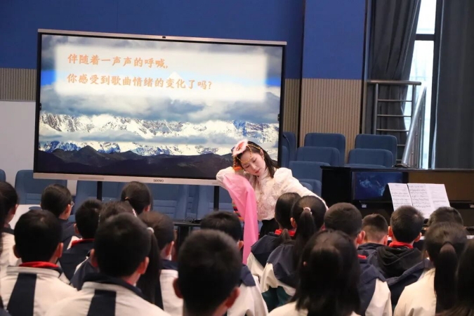 苏州工业园区斜塘学校张晴老师的教学展示《在那东山顶上》,通过学跳藏族舞蹈,引导学生从简单脚步入手,激发创编欲望,感受藏族歌曲的风格特点。