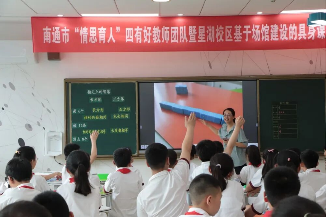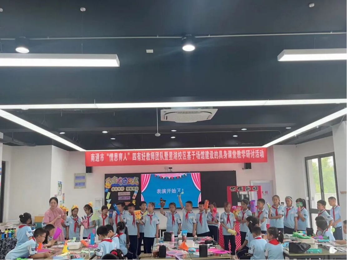 流萤染夏,栀子微香。 为进一步提升教师的课程实施能力,夯实教师专业素养和教育水平,更好地促进教师团队专业化成长,6月13日,南通市“情思育人”四有好教师团队暨星湖校区基于场馆建设的具身课堂教学研讨会如约而至,恰逢山西省阳泉市教研员教研管理与专业素养提升研修班50余人来校交流。