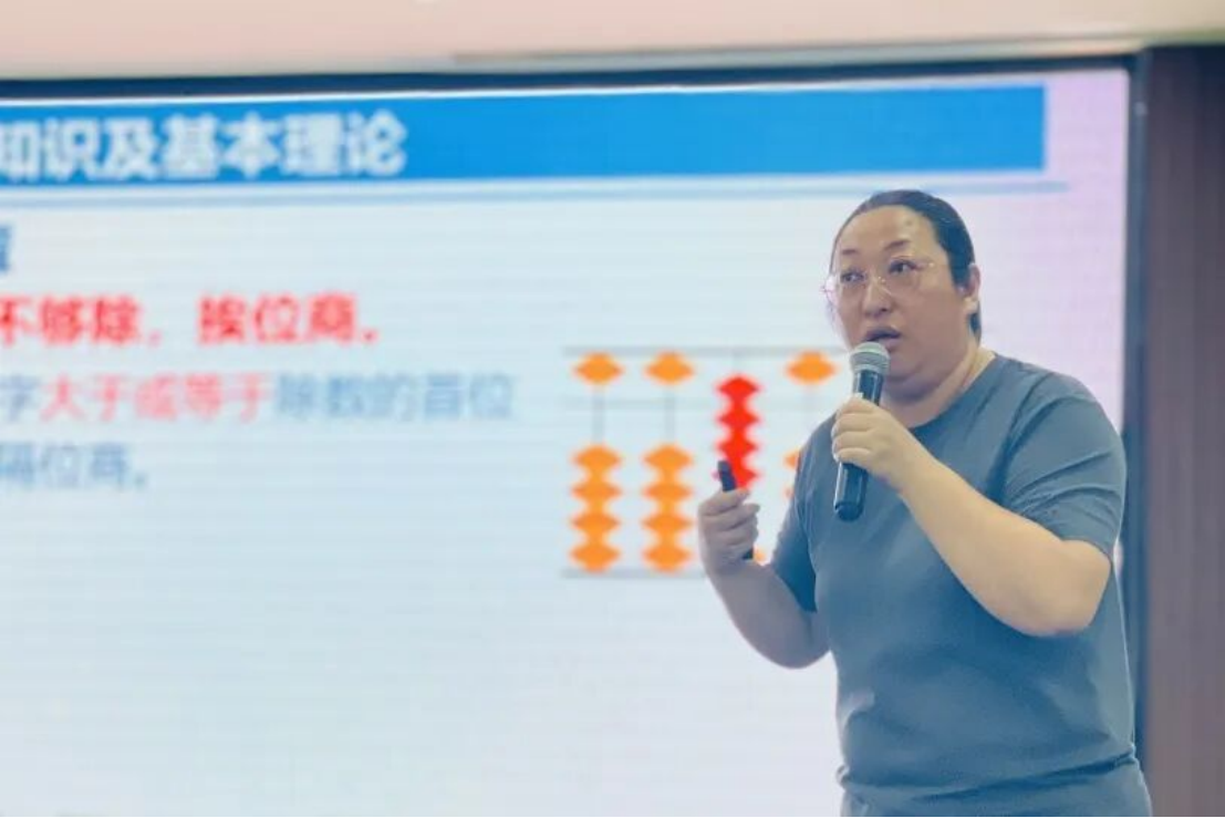 省珠心算种子教师徐宝琴,杨美娟分别对珠心算乘、除法基础知识及教材进行了解读,老师们一边专注地听着,一边认真地记着笔记,还不时地拨拨算盘。