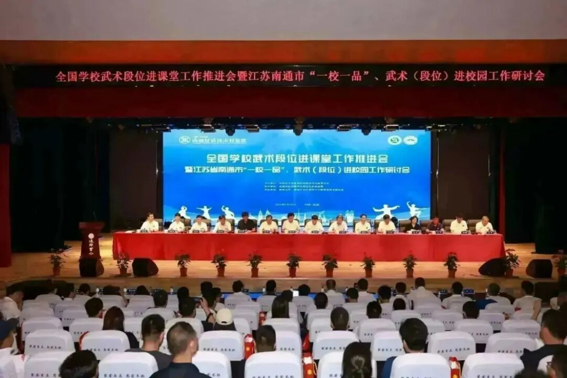 为深入学习贯彻党的二十大精神,深刻学习领会习近平总书记关于弘扬中华优秀传统文化的重要指示批示精神,加强武德教育,推进中华武术进校园、进课堂,6月20日,全国学校武术段位进课堂工作推进会暨江苏南通市“一校一品”、武术(段位)进校园工作研讨会在南通开发区实验小学教育集团龙腾校区顺利召开。本次会议由中国大学生体育协会民族传统体育分会主办,南通市经济技术开发区社会事业局承办。来自全国大近百名体育教育系统领导,中国大学生体育协会,民族传统体育峰会的各位专家参加了本次会议。本次会议由社会事业局副局长倪敏担任主持。