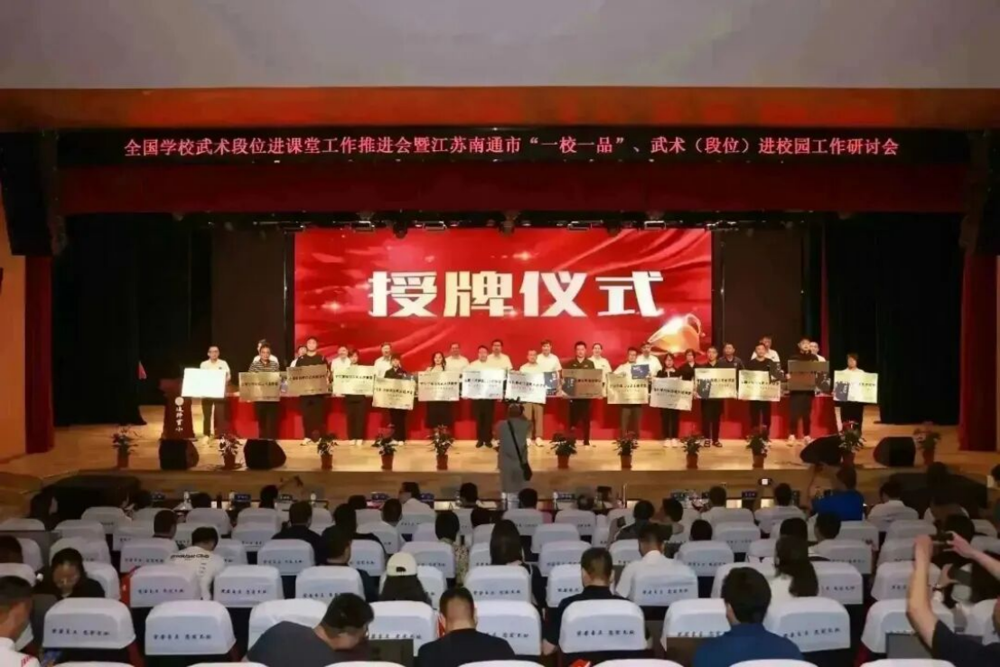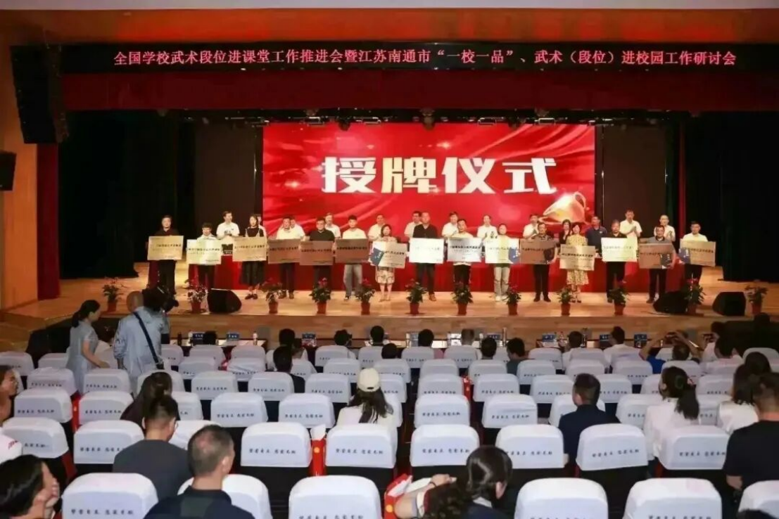 大会授予南通市教育局、南通市体育局、南通开发区社会事业局等3家单位全国学校段位武术进课堂突出贡献奖,授予复旦大学、浙江仙居中学、南通师范高等专科学校实验小学等51所大中小学为全国学校段位武术进课堂段位教学试验点学校。其中开发区的三家单位,我们实小集团的星湖校区、龙腾校区以及竹行小学获得试点学校授牌。