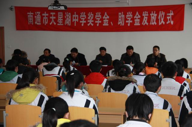 1月26日中午,我校举行了“天星湖中学2009年度助学金、奖学金发放仪式”。 十多年来,我校一直把资助贫困生作为贯彻教育公平原则的一项重要任务来抓,不让一名学生因家庭困难而耽误学业成了全校老师的共识。 本次助学金发放,我们共筹集了81000元,其中管委会专项助学金38500元,汇羽丰公司捐款12500元,开发区关工委资助4000元,天星湖中学“帮困助学金”6000元,全校教职工捐款20000元。这笔款项共为近100名家庭贫困的学生送去了温暖。 在助学金放发仪式上,学校党总支书记、校长徐新民同志殷切希望受助学生直面困难,立志成才,懂得感恩。南通市优秀班主任、劳动模范肖德梅老师也语重心长地告诫大家要用知识改变自己的命运。 南通电视台、南通人民广播电台到现场进行了采访。