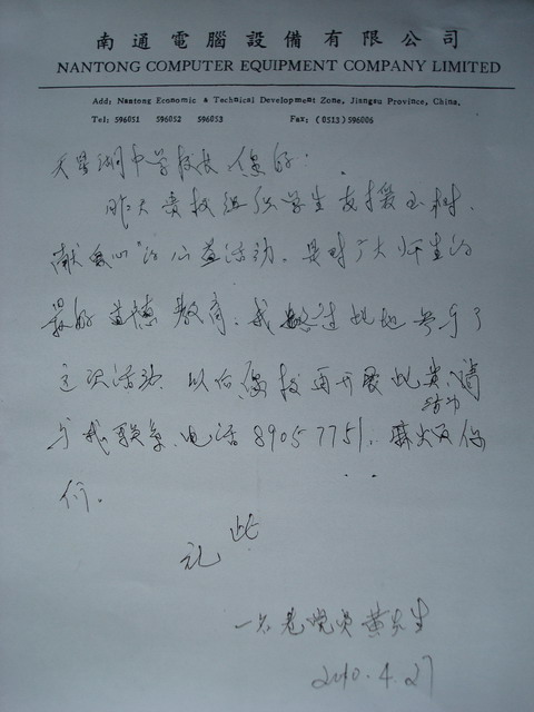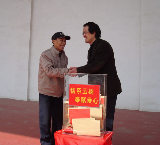 4月27日上午9:30,伴随着《爱的奉献》的乐曲,天星湖中学的运动场上正进行着“情系玉树,奉献爱心”的募捐活动。 此刻,路过校园的一位上了年纪的人看到了天星湖中学师生倾情募捐的场面,通过保安进入了校园,将口袋里仅有的50元钱捐了出来,但他又觉得似乎少了些,于是,又特地赶回家,拿了100元钱再次捐上。当问及他姓名时,他一再说不用告诉。 第二天,他还给学校送来了一封信,信上说:“昨天贵校组织学生支援玉树献爱心的公益活动,是对广大师生的最好的道德教育。我路过此地参与了这次活动。以后你校再开展此类活动,请与我联系。”落款为“一名老共产党员”。 事后了解到老人姓黄,家住开发区富民新村。 从老人俭朴的衣着,清瘦的外表看,他并不富有,但他高尚的品格让我们深深感动。 黄先生(左)捐款时的情景 黄先生的来信