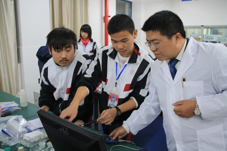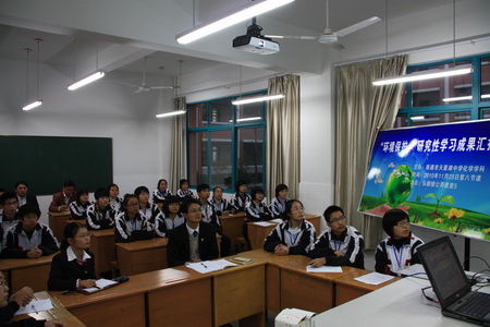 25日下午第四节课,评估专家组夏彤校长(江苏省梁丰高级中学)在徐新民校长的陪同下,考察了我校的研究性学习。 本次开出的研究性学习课程有三门,分别是有赖军老师指导的“环境保护”,有王毅南老师指导的“防震减灾,打造平安校园”,有仇爱军老师指导的数字化实验。