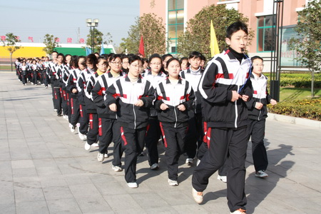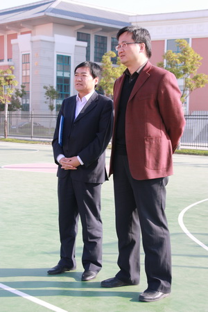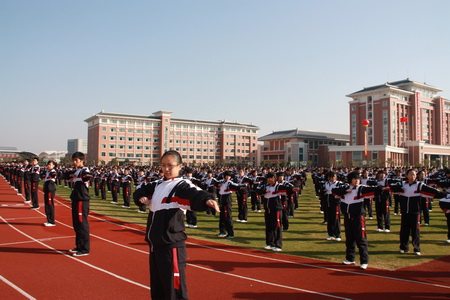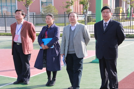 观看课间操 26日上午9:15分,随着运动员进行曲的响起,全校1400余名学生以最短的时间集中整队完毕,然后喊着响亮的口号,跑步走向操场。伴着优美的旋律,在青青草地上,同学们动作整齐地舒展肢体,做起了符合青少年特点、富有青春活力的广播体操。 评估组专家们和陪同领导也在第一时间到达操场,观看了同学们的表演。