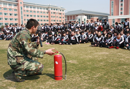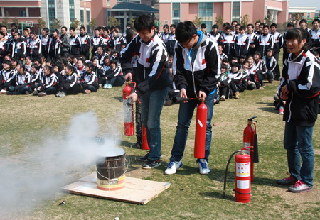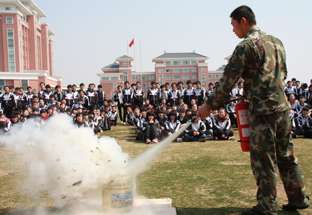 鉴于我校寄宿生人数多的特点,消防教育成了我校安全教育中的传统项目和重点内容。 今天,我校政教处邀请了开发区消防中队的教官们,先是对寄宿生进行了消防安全知识讲座,让大家在理论上了解消防知识的重点、难点;然后将学生集中到操场,由教官们进行现场灭火示范;接着教会学生如何准确地使用灭火器。 经过听讲和操作,同学们为自己的生命安全构筑起了一道坚固的防火墙。