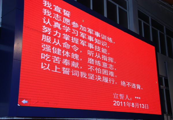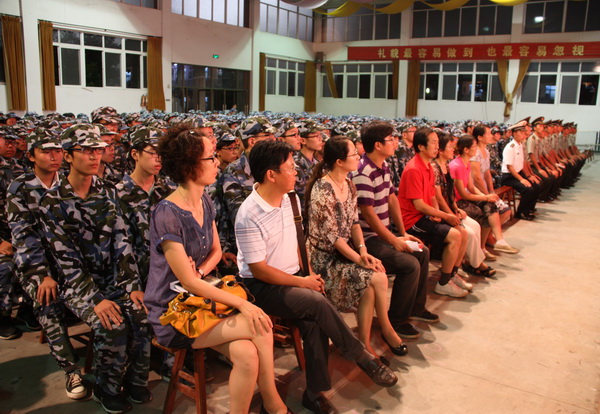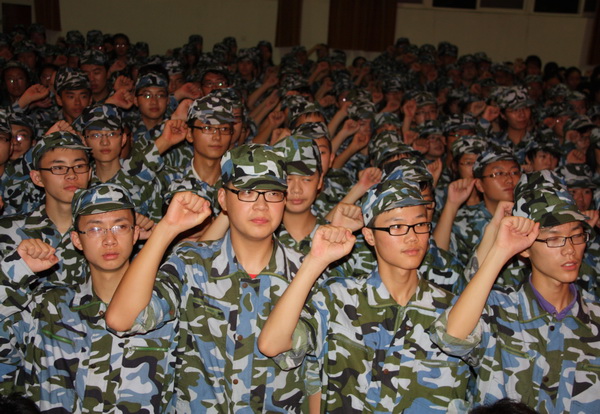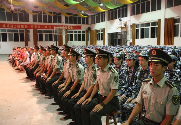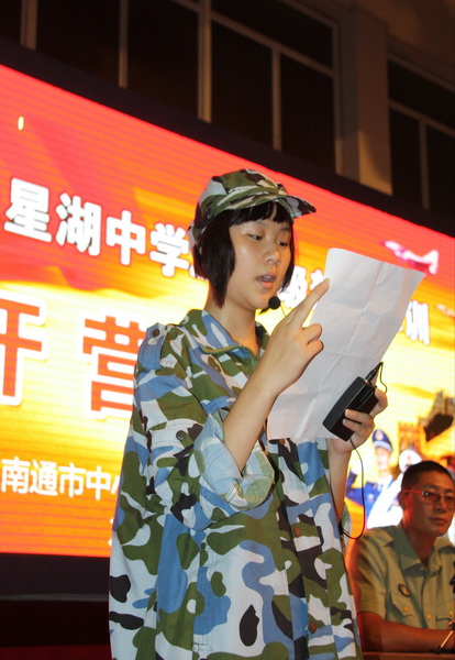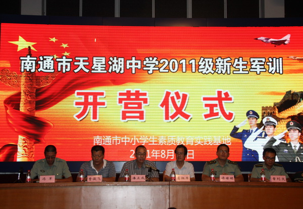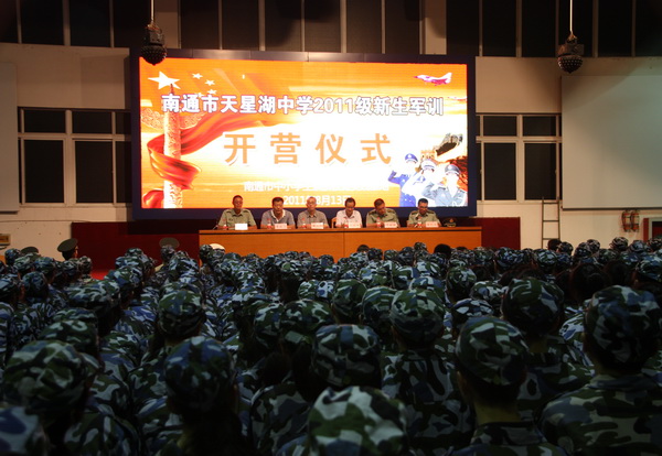 | 高一新生军训之开营 从踏入军训营地开始,一切都是军事化管理,原来学校的班级编排此时已由中队称号代替。由于本阶段有两所学校同时接受军训,所以我校原先的1—12班分别被称为16—27中队。 13日晚饭过后,同学们就换上了由军训基地统一提供的军人迷彩服,接着参加了基地的安全教育。 晚十点正,南通市天星湖中学高一新生军训开营仪式正式开始。身着草绿色军装、置身草绿色方队、目睹英姿勃发的教官、耳听铿锵有力的口令,同学们的心灵在一种全然未曾体验过的神圣的氛围中经受洗礼。 开营仪式上,我校葛红军校长助理以及基地领导、教官代表分别讲话,他们勉励同学们经受磨练,锻造意志,提高素质。学生代表也作了激情洋溢的发言。最后全体参训学生进行了庄严的宣誓。 据了解,本次军训教官来自解放军理工大学(号称军中的清华、北大),多为大三生,他们不仅素质一流,而且体格健壮、相貌堂堂。相信教官们的调教会让那些父母无微不至呵护下的文弱书生们变成铮铮硬汉、飒爽女子。