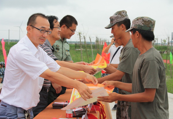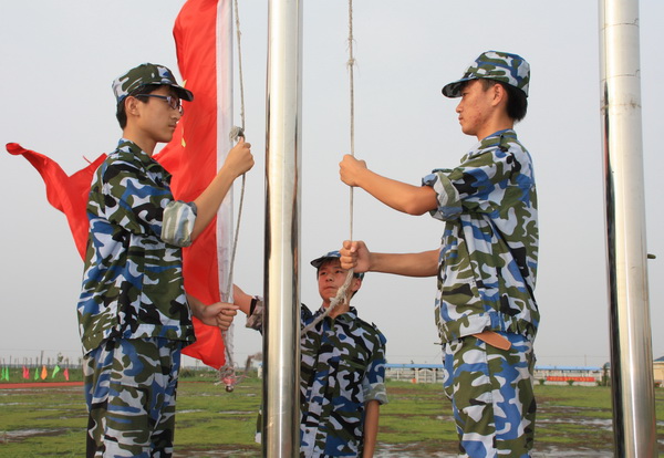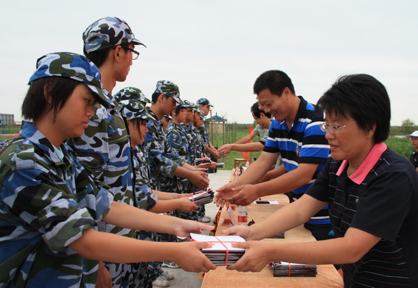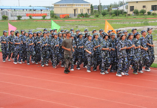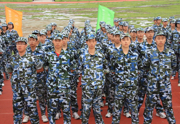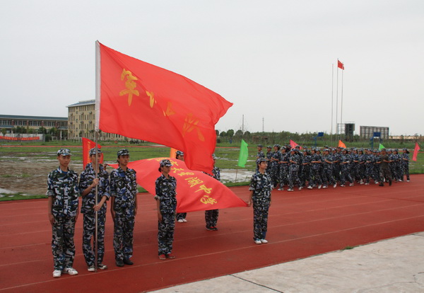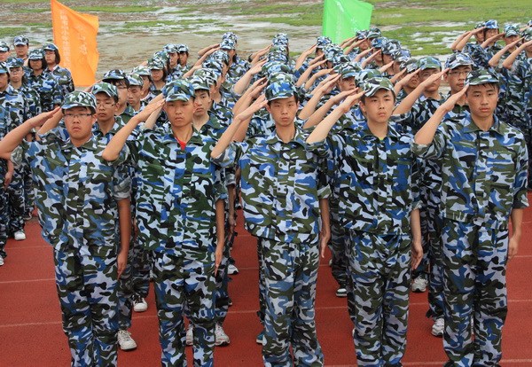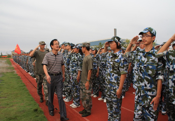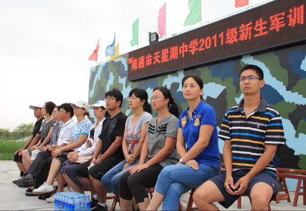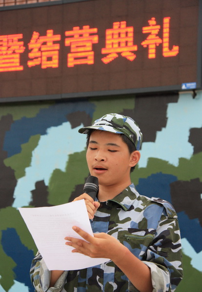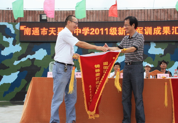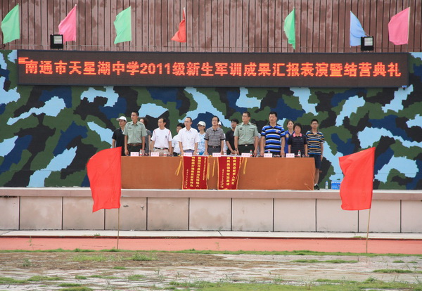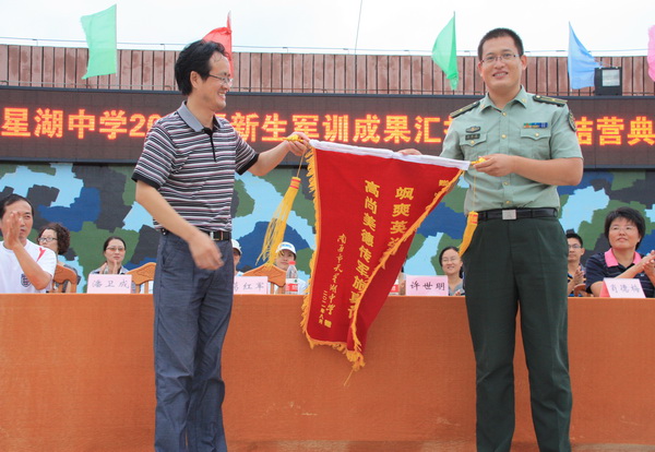 高一新生军训之结营 在庄严的升国旗仪式之后,全体参训的高一新生又以注目礼的形式迎接军训大队队旗和天星湖中学校旗入场;接着,天星湖中学校长助理葛红军同志在军训大队长的陪同下,检阅了高一新生参训方阵;然后,各中队在教官的指挥下,以严正的军姿、威武的气势、整齐的步伐跑步通过主席台,此刻只听到动地的脚步声和冲天的口号声,凝聚着同学们五天心血和汗水的军训成果在这时得到了充分的展示,主席台上的领导 结营仪式上,葛红军校长助理发表了言辞恳切的讲话,他对几天来教官们的辛勤付出表示感谢,对同学们取得的成绩表示祝贺,对班主任的敬业精神表示赞许,并希望同学们将训练中培养形成的精神品德在今后的学习中加以发扬。学生代表张钧同学也在发言中感谢教官,感谢班主任,并表示一定不辜负教官的鼓励,好好学习,早日成才。军训大队长许世明通报表扬了本次军训中取得优异成绩的中队和同学,发给了奖状和证书。最后,葛红军校长助理代表学校向军训基地和担负军训任务的解放军理工大学赠送了锦旗。