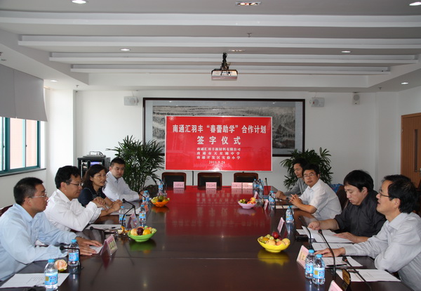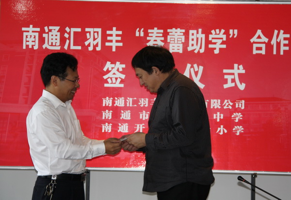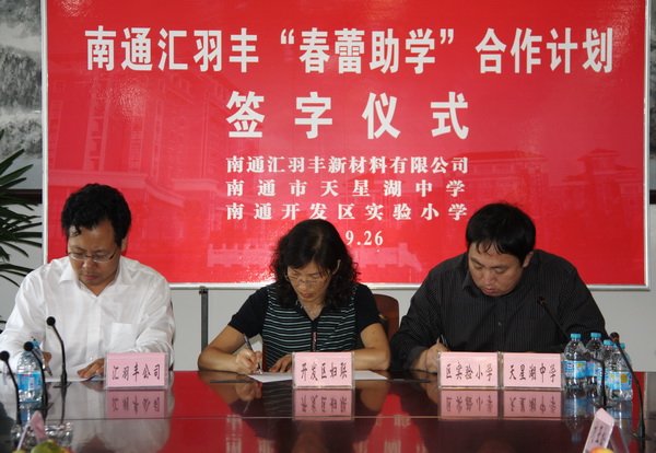 一向有着捐资助学优良传统的南通汇羽丰公司今天又慷慨解囊,与天星湖中学、开发区实验小学续签2011年“南通汇羽丰‘春蕾助学’合作计划协议书”。 在南通开发区妇联领导范宜香的主持下,签字仪式隆重举行。仪式上,实验小学校长赵建华、天星湖中学校长助理葛红军先后简要汇报了学校的办学情况和2010年汇羽丰专项助学金使用情况,并对汇羽丰公司汇报社会、捐助学子的高尚义举表示感谢;接着汇羽丰公司老总张金虎讲话,他觉得为贫困学子雪中送炭是公司的应尽职责,今后将随着公司的发展不断提高捐助的数额,为一些贫困学生通过学习改变命运从而实现自己的人生理想贡献绵薄之力;最后,张金虎老总在开发区妇联领导范宜香的见证下分别与天星湖中学校长徐新民、实验小学校长赵建华签订了“汇羽丰‘春蕾助学’合作计划协议书”。