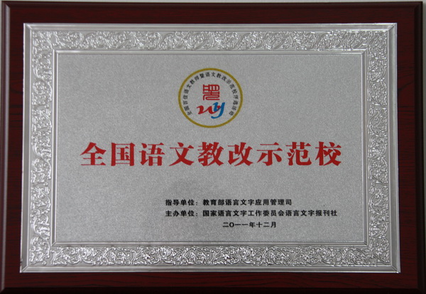我校喜获“全国语文教改示范校”称号 近日,我校获得了由教育部语言文字应用管理司、国家语言文字工作委员会语言文字报刊社颁发的“全国语文教改示范校”的荣誉奖牌。 我校现有27位语文教师,其中有2位江苏省语文特级教师,1位南通市语文学科带头人,2位南通市语文骨干教师,建有“陈明华名师工作室”、“缪爱民名师工作室”、“戴继华名师工作室”等三个南通开发区名师工作室。精良的语文教师队伍为语文教改奠定了雄厚的基础。近几年,我校语文学科组的老师无论是教研文章的发表,还是语文公开课的展示,都取得了骄人的成绩。如今“全国语文教改示范校”荣誉的获得,无疑将促进和推动我校的语文教改进一步向纵深发展。