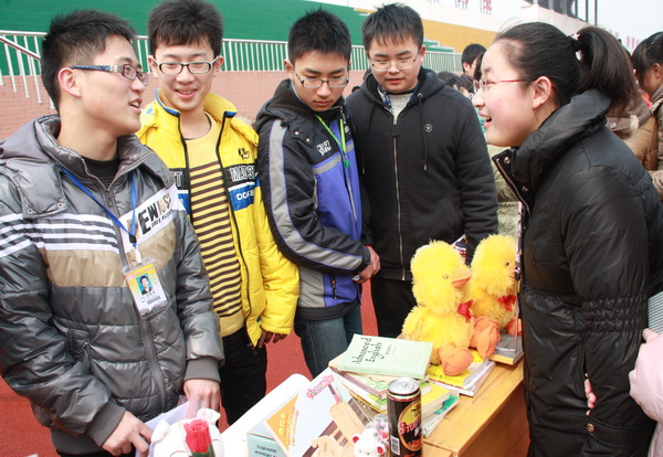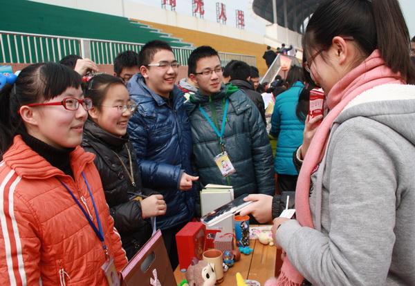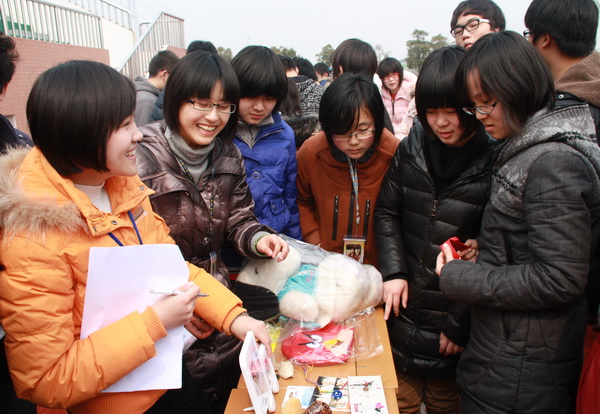 “摊主”们个个热情高涨,各显神通,纷纷拿出了“练摊”的看家本领,有的拿着“商品”游说于人群中,有的将“目标客户”拉到自己班级的“摊位”前,还有的带着化妆面具站在高高的桌子上,用各种奇特的装扮吸引买家……