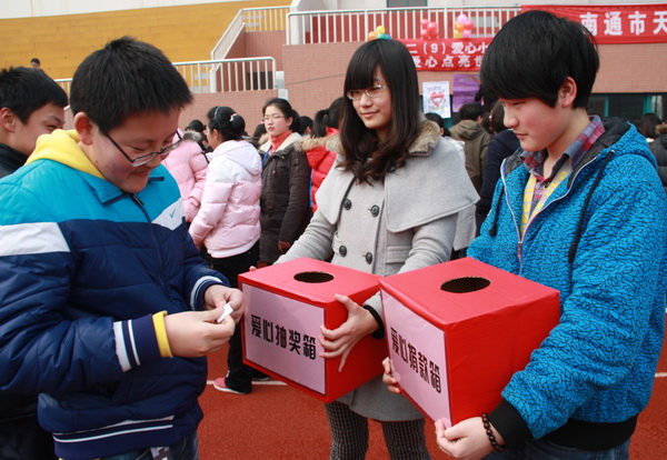 主席台正中的“爱心抽奖”是今年学生会的创新环节,“奉献你的爱心,试试你的运气”的吆喝声此起彼伏。此环节抽奖的奖品均由班级捐献,然后交与学生会组织爱心抽奖,仅此环节,就筹得善款832.1元。