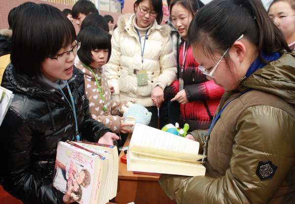义卖活动现场,人头攒动,人声鼎沸,汇成了一片热闹的海洋。大家以班级为单位,高举着各式各样、色彩缤纷的“爱心义卖”宣传海报,五花八门的义卖物品让人眼花缭乱,不仅有各种学习用品、生活用品、CD、图书、毛绒玩具和包装精美的礼品,还有同学们自己亲手制作的十字绣和其他工艺品。