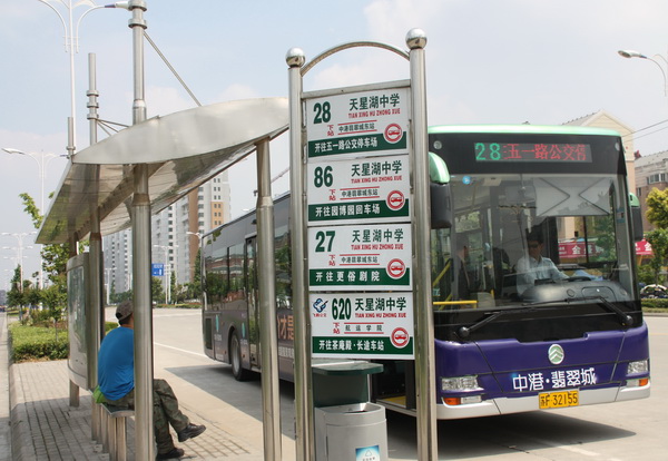 昔日出行难 如今交通畅 天星湖中学2009年搬入现在的新校区之后,尽管周边道路宽阔,四通八达,但没有通向市区的公交车,更没有公交站台,给师生出行带来了诸多不便,尤其是让来校探望学生的家长望车兴叹。 近一年来,随着基础建设步伐的加快,天星湖中学校门西侧不但建起了漂亮的公交站台,而且有27(工贸学校—更俗剧院)、28(工贸学校—五一停车场)、86(工贸学校—园博园)、620(农场—长途车站)等四条线路经过学校,每班车15分钟左右就靠站一次,这给学生周末回家或家长平时来校探望子女带来了很多便利。 由于公共交通的便捷,加上本校双周末校车接送远途学生的措施,本校2011级高一新生中,就有三分之二的生源来自开发区以外的区域。看来交通的发展也为学校的发展带来了良机。