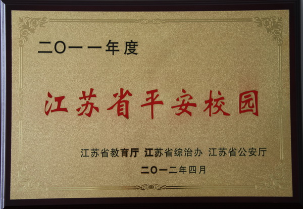 近日,我校获得了由江苏省教育厅、江苏省综治办、江苏省公安厅联合颁发的2011年度“江苏省平安校园”荣誉奖牌。 去年年底,经过学校申报、上级验收、省厅公示,我校“江苏省平安校园”的创建工作终获成功。 长期以来,我校十分注重校园平安工作,既有硬件上技监设备的投入,保安全天24小时的值守,居住地派出所的支持配合,更有全校师生思想上的警惕和措施上的到位,从而保证了了全校2000余名师生能安静地工作、学习、生活。 今后,我们将以获得“江苏省平安校园”的荣誉为契机,一如既往地重视校园平安,努力为全校师生营造一个平安、文明、和谐的校园环境。