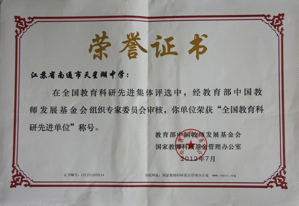 近日,在全国教育科研先进集体评选中,经教育部中国教师发展基金会组织专家委员会审核,我校荣获全国“全国教育科研先进单位”称号。 百尺竿头,理当更进一步。我校愿此为契机,进一步开展教育科研活动,既以教学活动为基础,不断总结经验,提升理论,同时又反作用于教学实践。