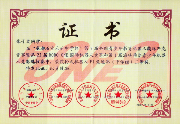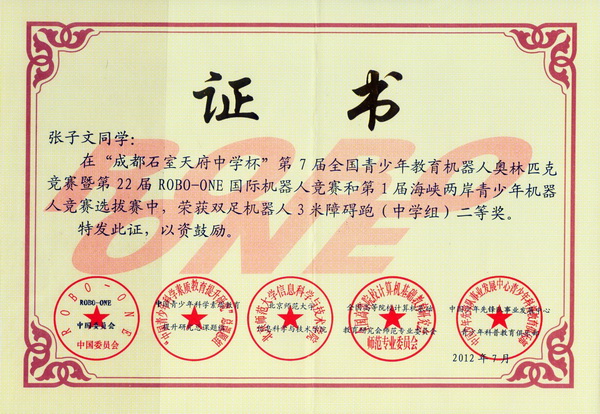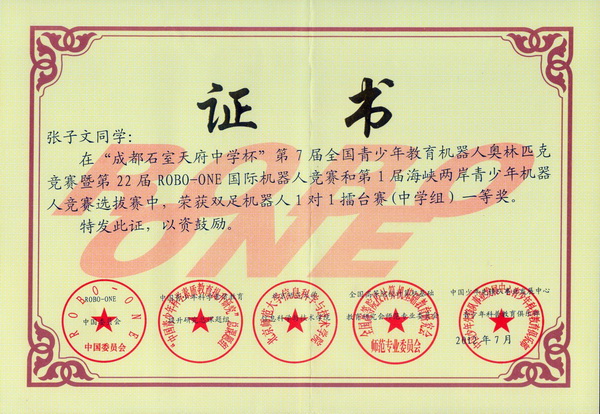 近日,我校高二年级学生张子文同学在“成都石室天府中学杯”第7届青少年教育机器人奥林匹克竞赛暨第22届ROBO—ONE国际青少年竞赛和第1节海峡两岸青少年机器人竞赛选拔赛中表现出色,获奖丰厚。他分别获得了双足机器人1对1擂台赛(中学生组)一等奖、双足机器人 张子文同学获奖与我校在新课改中重视学生的素质教育、科学教育和他本人的兴趣爱好密不可分。但愿张子文以及广大同学在新的学期取得更多、更好的成绩。