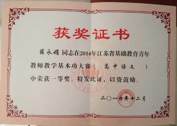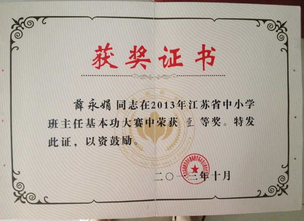薛永娟老师获省班主任基本功大赛一等奖证书 |